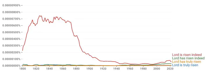 “The Lord is truly risen” is beaten by each other variation, giving a huge victory to “The Lord is risen indeed”, particularly in books published between 1800 and 1920.